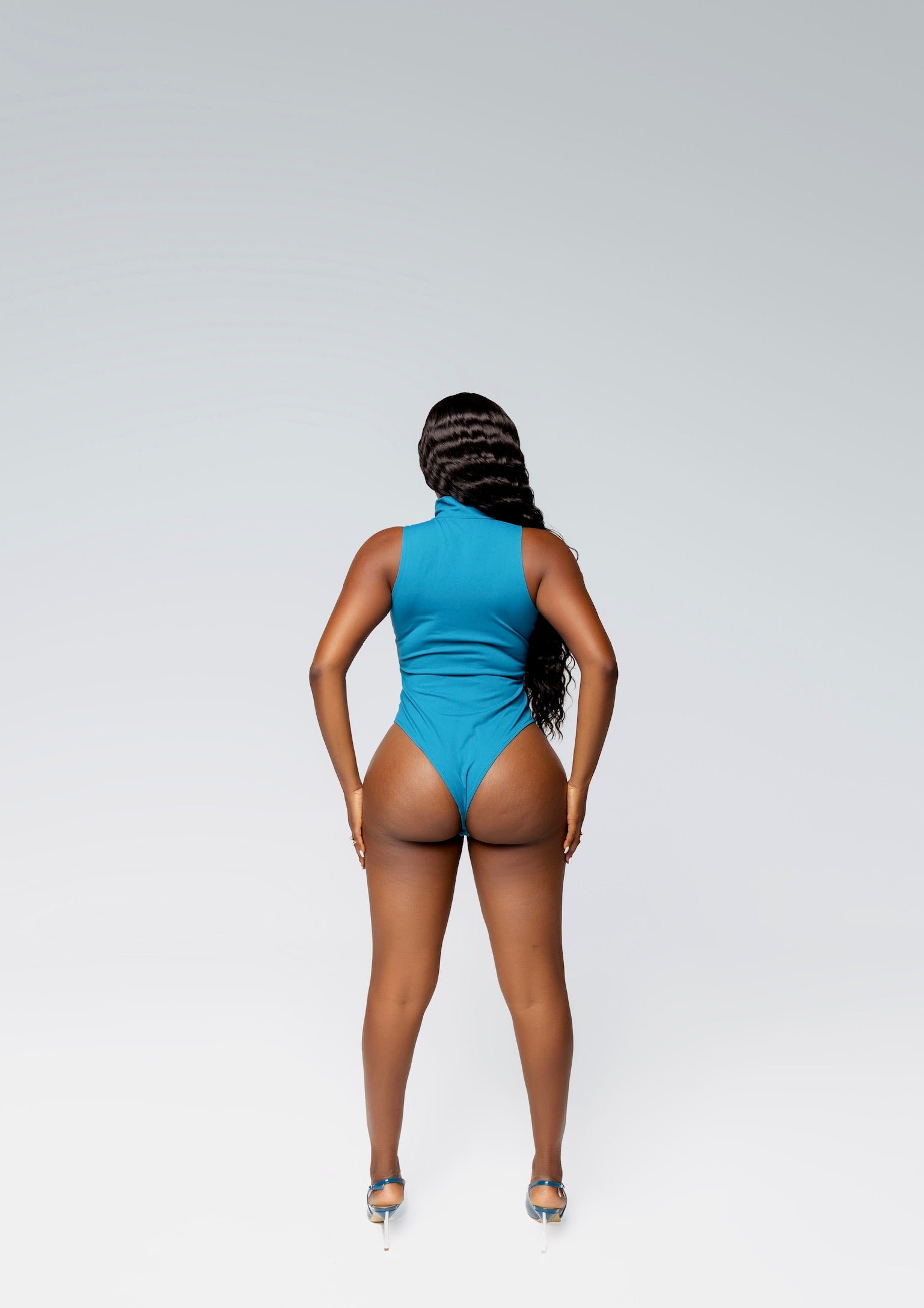 Command attention in our Turquoise Sleek Bodysuit, where elegance meets edge. This high-neck, sleeveless design features a buttery-smooth stretch fabric that hugs your curves while offering maximum comfort. The bold front zipper with a gold accent adds a luxe touch, making this piece perfect for layering or wearing solo.